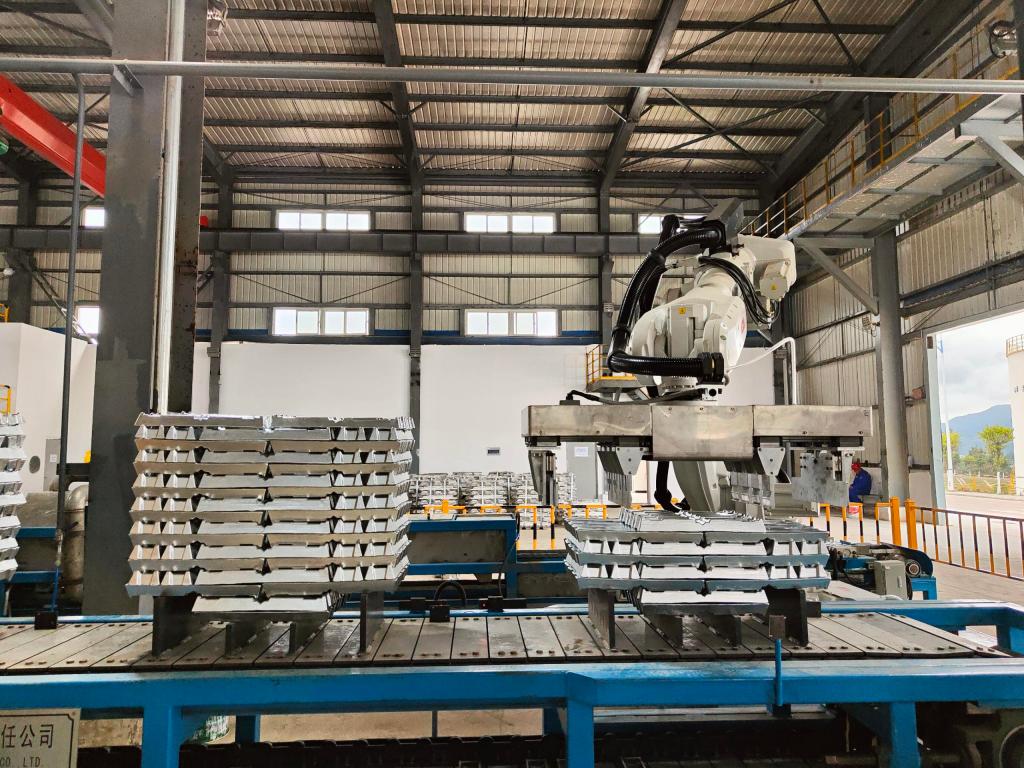 文山鋅銦年產(chǎn)3萬噸壓鑄鋅合金項(xiàng)目是云錫文山片區(qū)兩公司“倍增翻番”計(jì)劃項(xiàng)目之一,也是文山州2022年“四個(gè)三十”重點(diǎn)建設(shè)項(xiàng)目之一,同時(shí)也是公司依托年產(chǎn)10萬噸鋅冶煉熔鑄系統(tǒng)高效穩(wěn)定運(yùn)行基礎(chǔ)優(yōu)化升級(jí)實(shí)施項(xiàng)目,采用先進(jìn)、環(huán)保、節(jié)能的合金工藝和設(shè)備,主體設(shè)備選用“有芯感應(yīng)爐+可傾有芯感應(yīng)爐+電阻保溫爐”,配套液壓升降式加料裝置,合金爐自帶稱重保障精準(zhǔn)配料,探針聯(lián)鎖穩(wěn)定控制出液流量,機(jī)器人高效自動(dòng)扒皮,風(fēng)冷搭配均水噴淋,激光打碼自動(dòng)碼垛、打包、稱重、貼簽,全流程自動(dòng)化高,控制精準(zhǔn),操作規(guī)范,精選99.996%以上鋅片搭配99.85%重熔鋁錠和99.95B鎂錠作為合金錠生產(chǎn)原料,與現(xiàn)有工藝實(shí)現(xiàn)閉環(huán),形成了一套完整的環(huán)保、低耗、資源綜合利用的冶煉產(chǎn)業(yè)鏈體系。該項(xiàng)目于2022年8月8日開工,10月9日點(diǎn)火烘爐,10月27日投料一次性產(chǎn)出合格產(chǎn)品,其產(chǎn)品表面光滑平整、斷面晶粒均勻、金屬質(zhì)感強(qiáng)、錠垛規(guī)整,物規(guī)質(zhì)量、化學(xué)成分穩(wěn)定,各項(xiàng)指標(biāo)明顯優(yōu)于國標(biāo)。