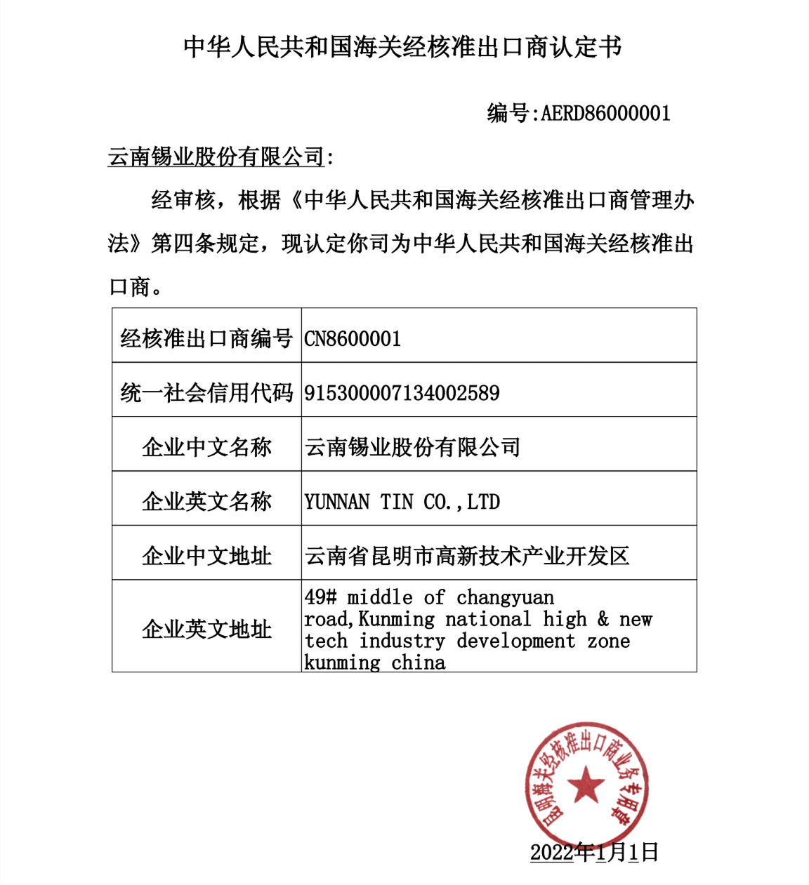 錫業(yè)股份成為云南省首家經(jīng)核準(zhǔn)出口商