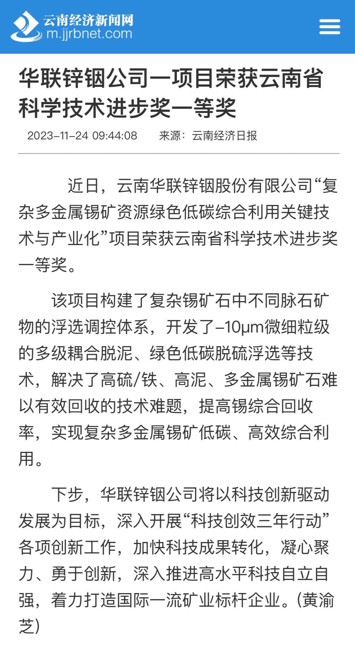 云南經濟日報:華聯鋅銦公司一項目榮獲云南省科學技術進步獎一等獎