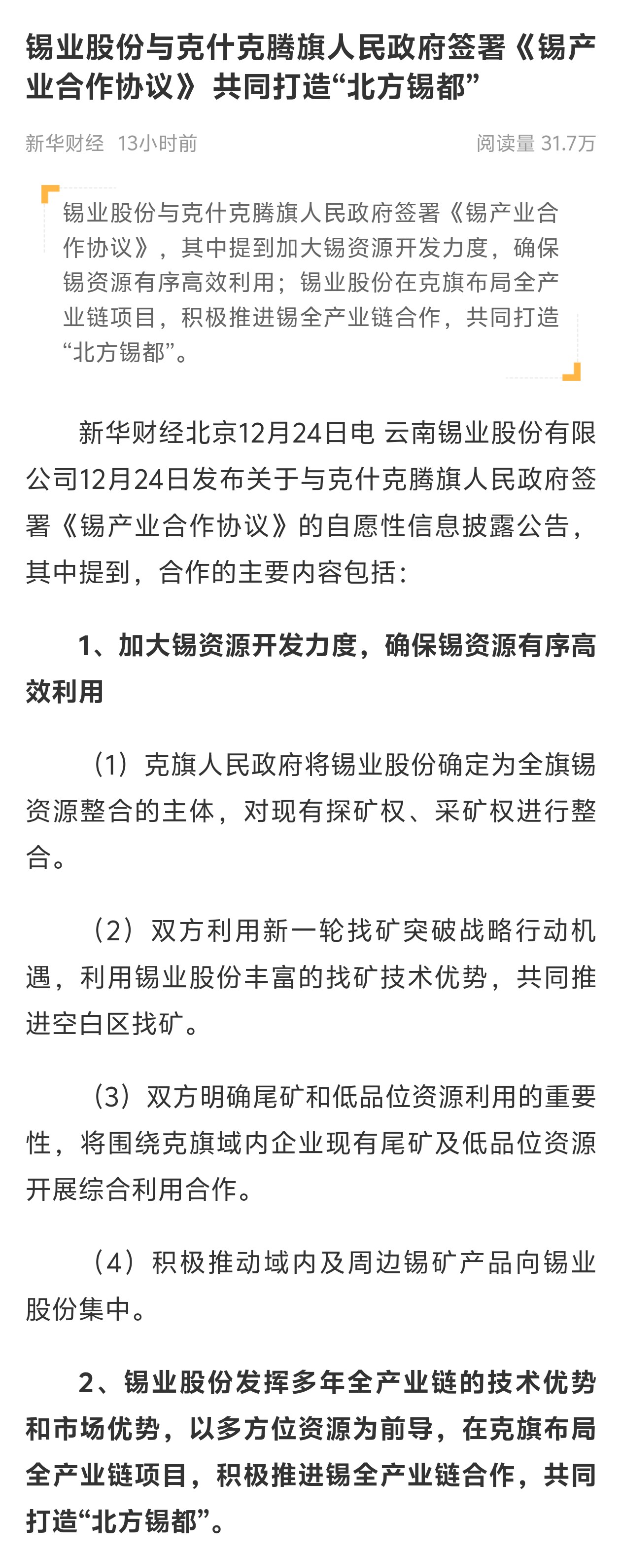 新華財經:錫業(yè)股份與克什克騰旗人民政府簽署《錫產業(yè)合作協(xié)議》 共同打造“北方錫都”
