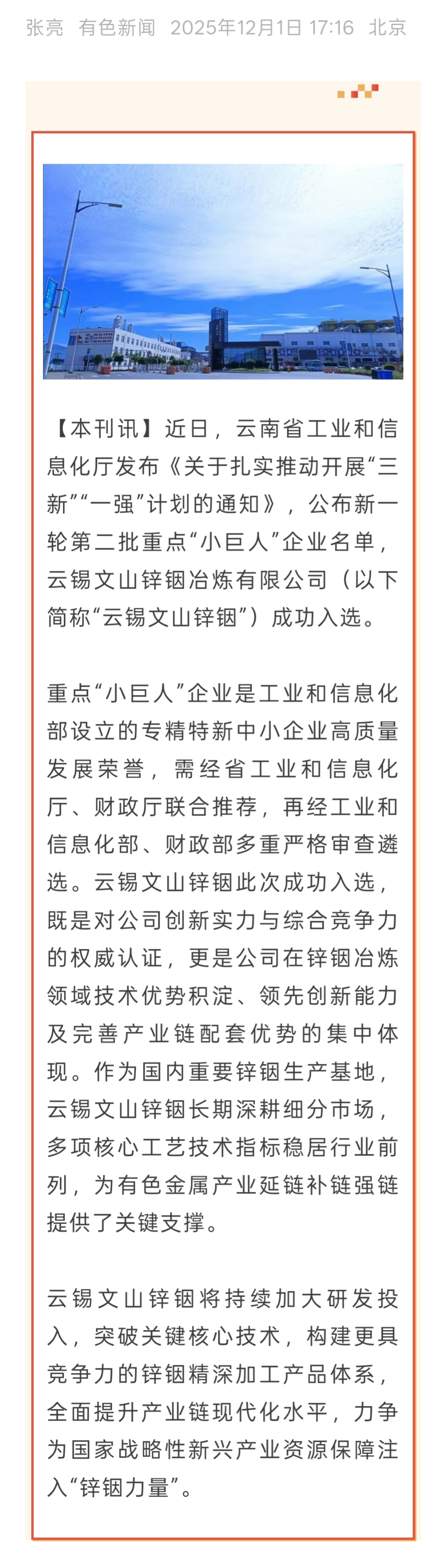有色新聞:云錫文山鋅銦成功入選工業和信息化部重點“小巨人”企業