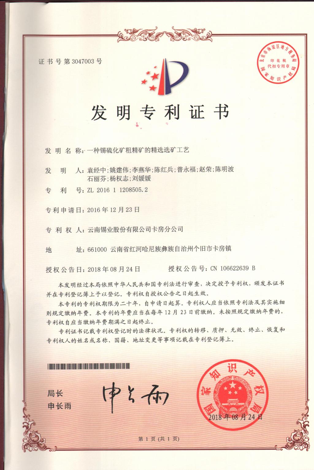 近日,卡房分公司申報的發明專利《一種楔鍵形襯板結構溢流型球磨機及其襯板安裝方法》《一種錫硫化礦粗精礦的精選選礦工藝》再獲國家知識產權局正式授權,并授予國家發明專利證書。這是今年繼8月份該分公司申報的發明專利《一種共生硫化礦中富含高砷硫精礦的降砷選礦工藝》《一種皂類捕收劑GY-10藥劑溶液的溶解配制方法》獲國家發明專利證書之后,再獲兩項發明專利授權。