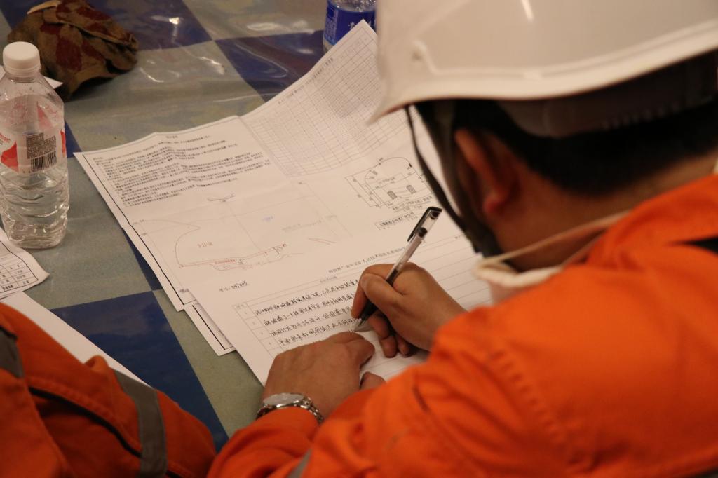 參賽人員經(jīng)過安全員入坑安全培訓(xùn)后前往本次考試地點(diǎn)塘子凹坑的主力采場(chǎng)3-11-5E,由于高手云集,最后一輪比賽標(biāo)準(zhǔn)更高,要求更嚴(yán)。比賽現(xiàn)場(chǎng),選手們信心滿滿,躍躍欲試,氣氛嚴(yán)肅卻又不失親切。拿到考題后認(rèn)真勾畫,緊抓重點(diǎn)。在迎頭上,選手們沉著迎戰(zhàn),從容不迫,認(rèn)真排查現(xiàn)場(chǎng)與施工單上“異樣”,反復(fù)查看,爭(zhēng)取不漏任何細(xì)節(jié)。